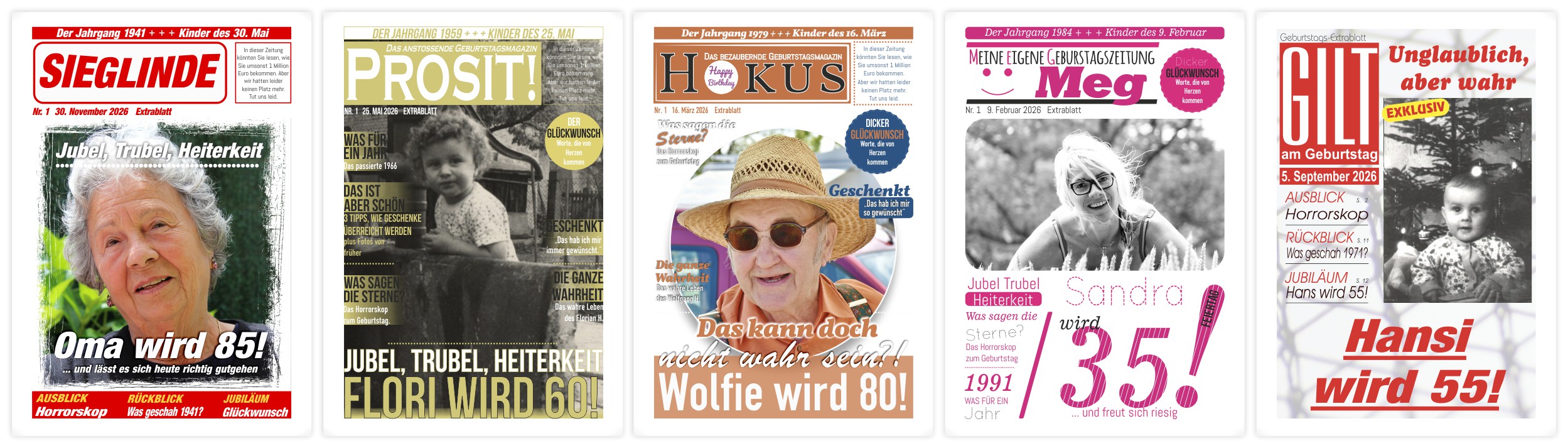 - Dies ist die Königin der Geburtstagszeitungen: Die 16 Seiten bieten Unterhaltung pur. Die bis zu 16 Fotos machen das Geburtstagskind allgegenwärtig. Die Hälfte der Bilder verteilt sich über die ganze Geburtstagszeitung, von der Titelseite bis zum Glückwunsch und auf 6 Artikel. 5, 6 Fotos, z.B. aus Kindheit, Jugend, Hochzeit, aktuell, können als Fotowand auf der Mittelwand eingebracht werden.